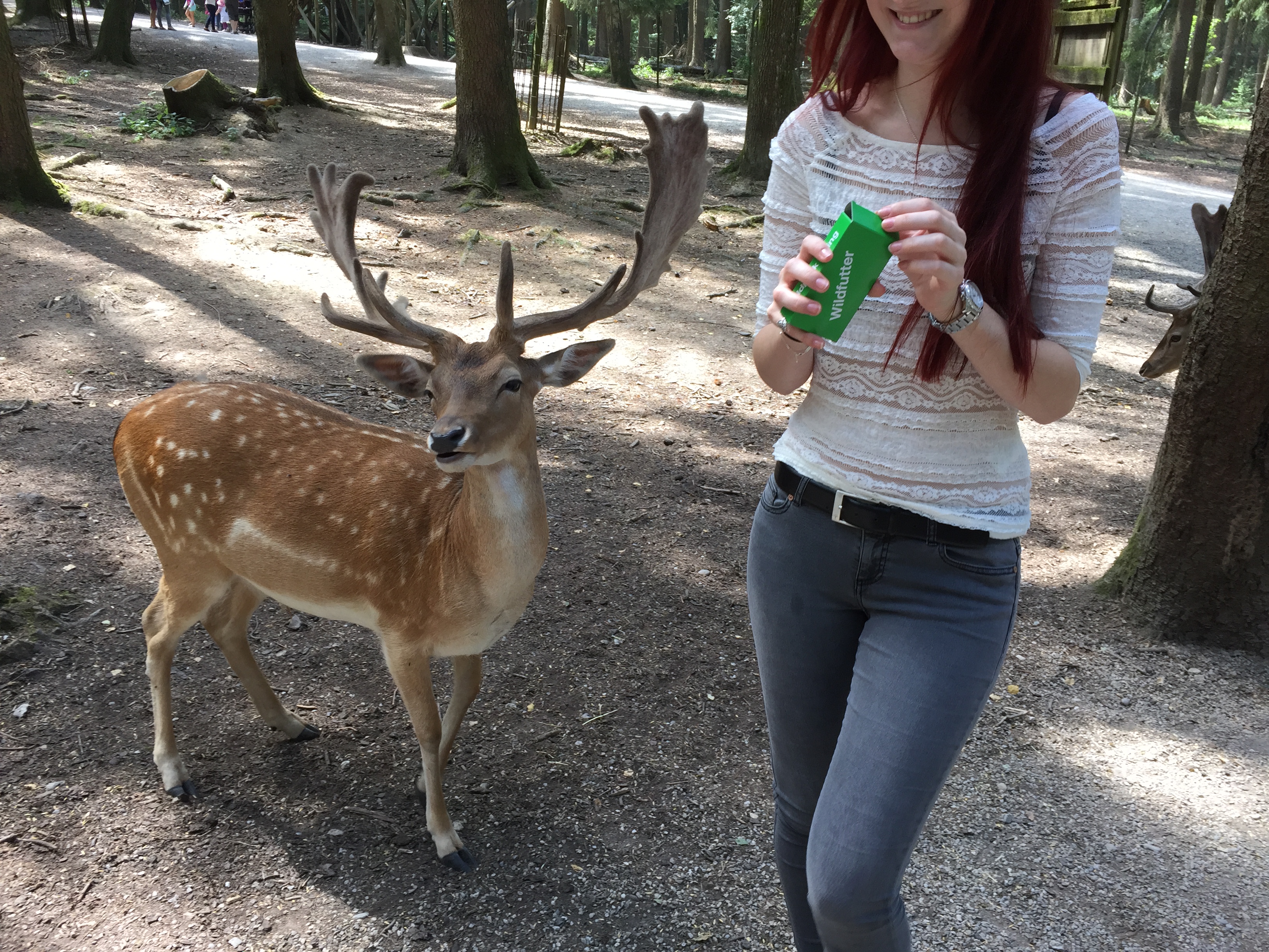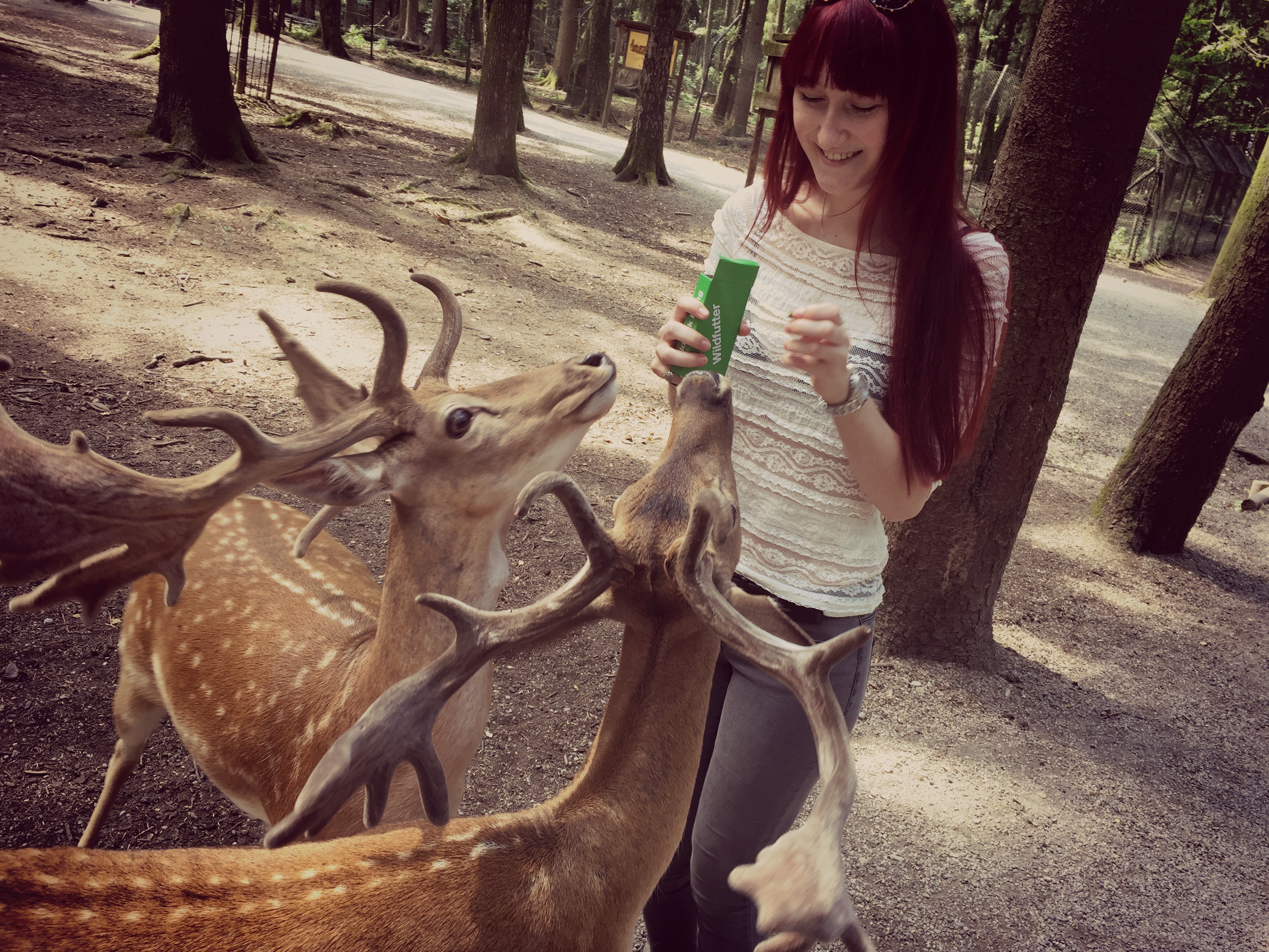 Zuerst habe ich mir noch Futter für die Rehe und Ziegen an einem Automaten gekauft, das kostet nochmal 0,50 € und hat mir für den ganzen Rundgang gereicht. Gleich am Anfang ist man schon mitten im Geschehen. Die Tierchen sammeln sich bereits am Eingang und warten nur darauf gestreichelt und gefüttert zu werden. Mega zutraulich und etwas aufdringlich aber wenn die weichen Lippen den kleinen Futterchip aus der Hand schlabbern freut man sich wie Schnitzel.