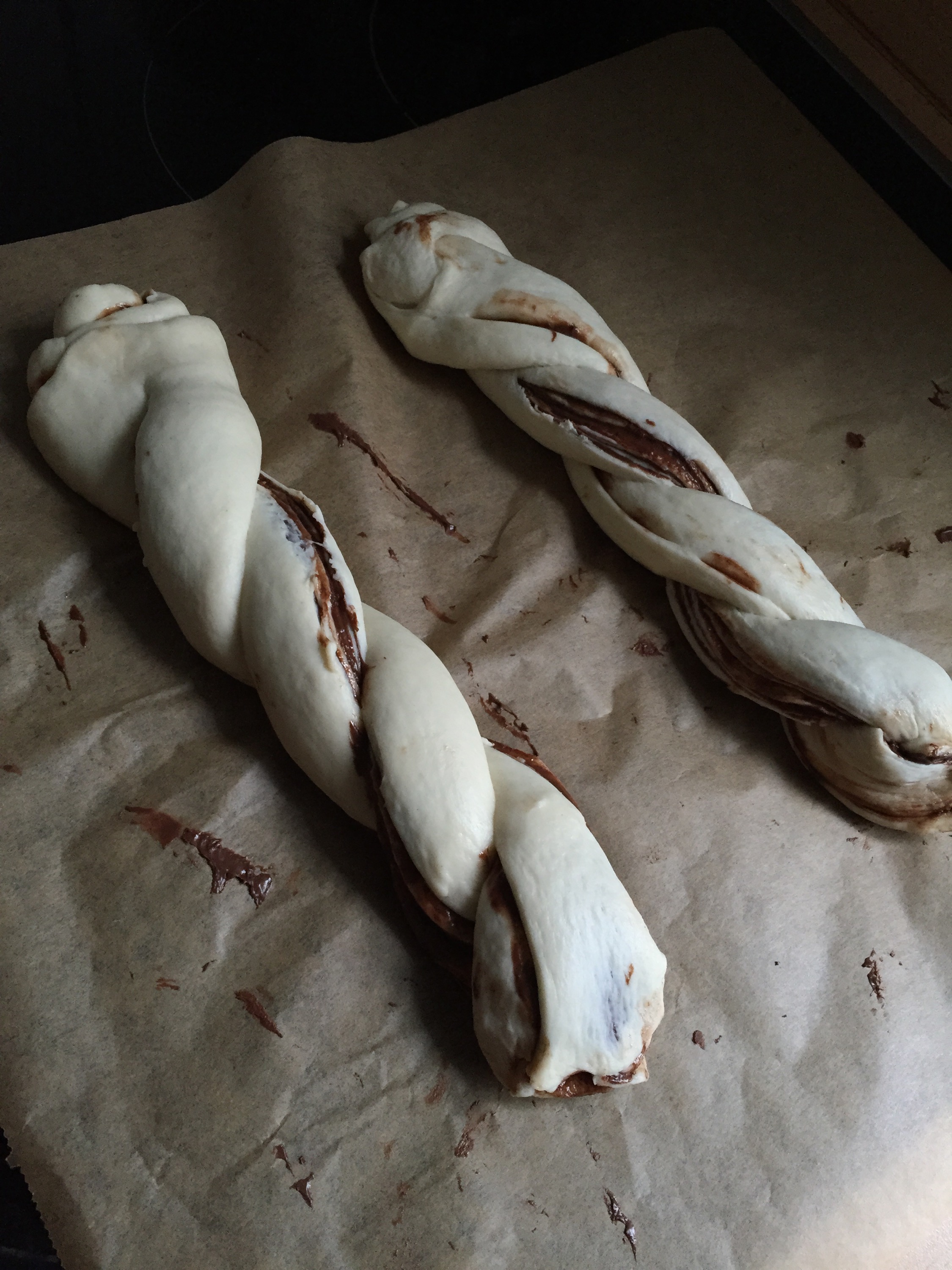 2. Als nächstes rollst du den Teig auf einem Blech aus und bestreichst ihn mit Nutella. Ich würde nicht zu viel nehmen damit nichts ausläuft.