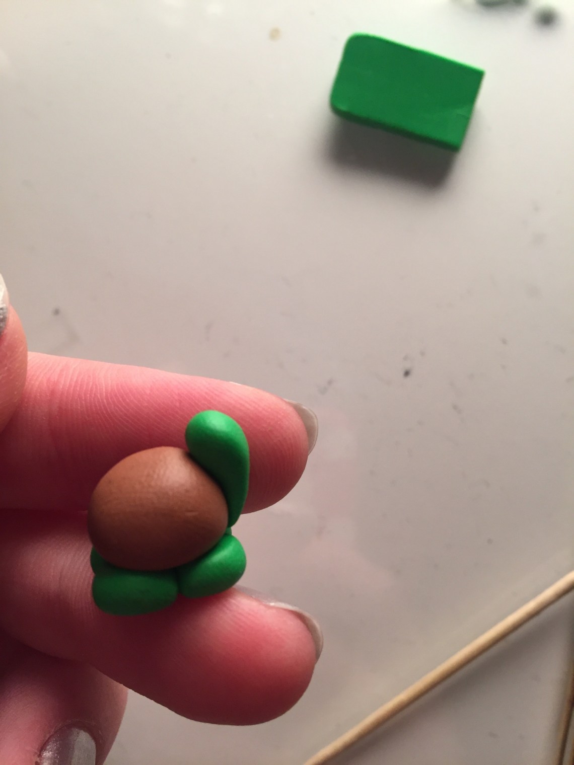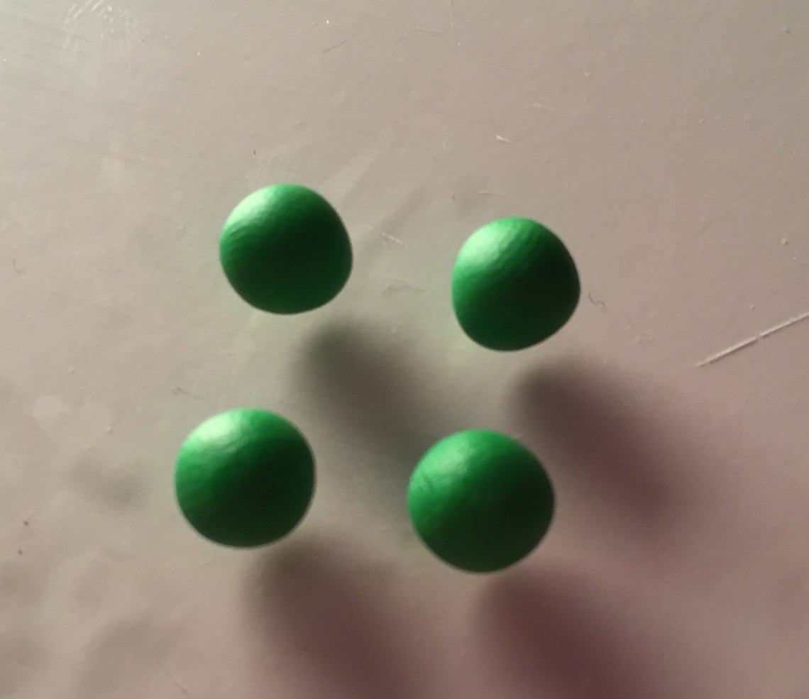 2. Mit dem grünen Fimu formt ihr 4 kleinere Kugeln für die Beine.