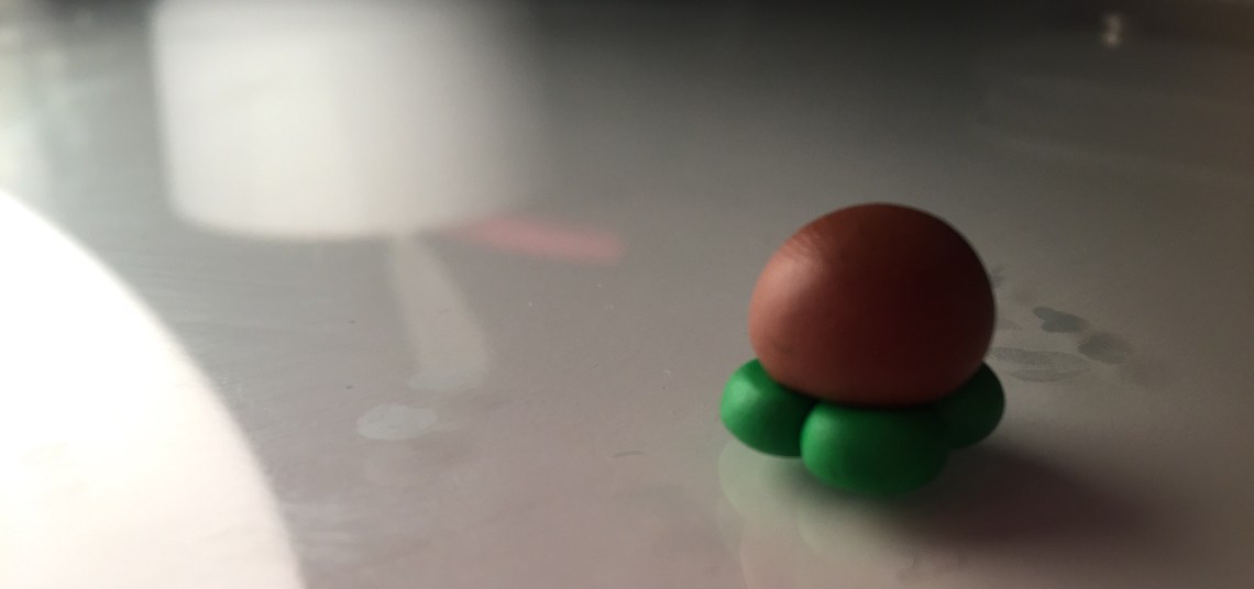 2. mit 2 kleinen orangenen Kugeln, kann man die Füße machen. Diese muss man dann in herzform bringen. Ganz wichtig ist hier, das der „Boden“ auf dem die kleine Bombe steht wirklich gerade ist, sonst fällt sie schnell um. (Hier seht ihr übrigens das Dilemma, wenn man zuerst die schwarze Knete benutzt, also Vorsicht!)