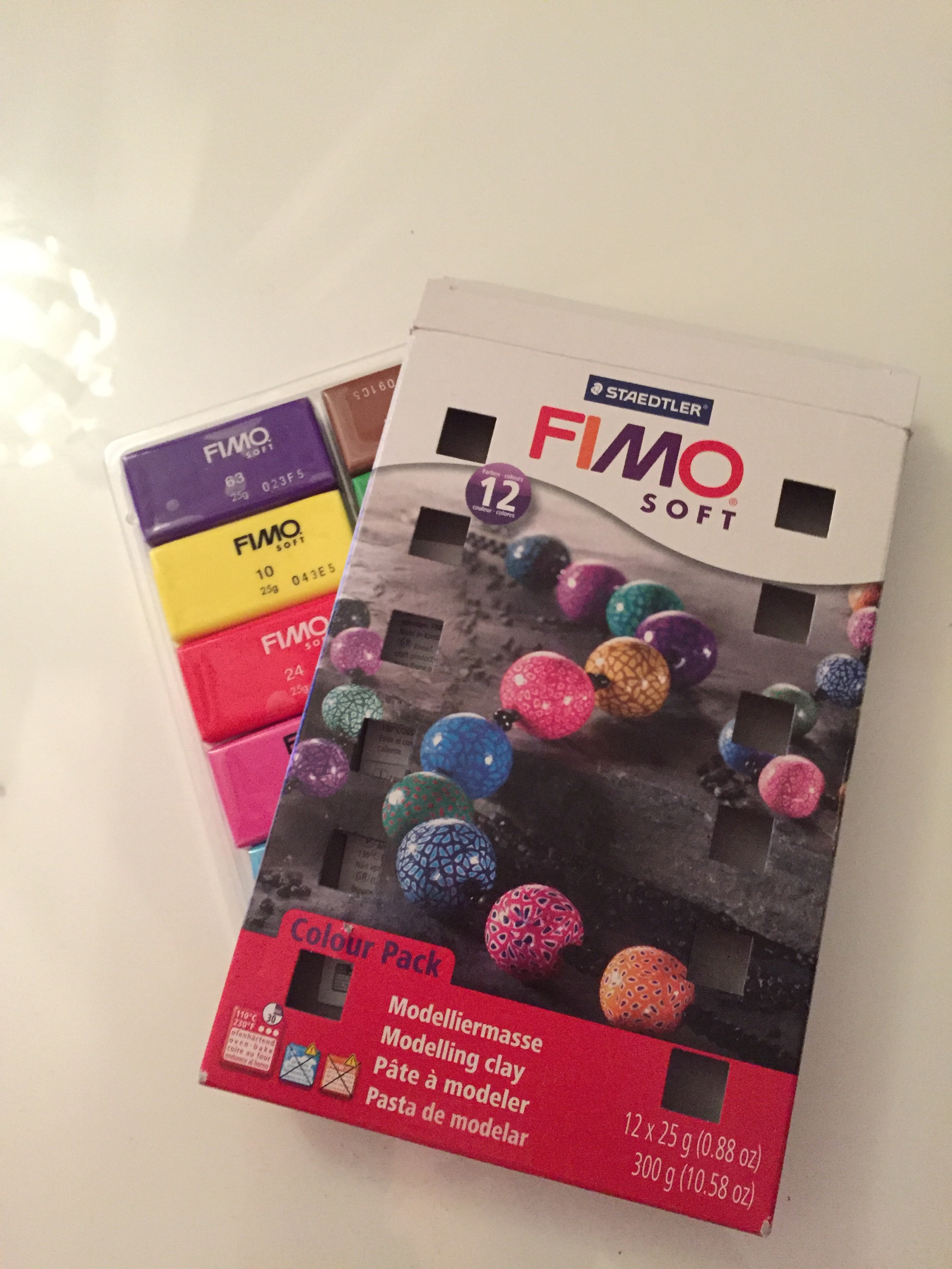 Eine Packung Fimo kostet normalerweise so 4 Euro. Da ich es aber nur mal probieren wollte habe ich dieses Päckchen bei Amazon für knappe 10 Euro gekauft.
