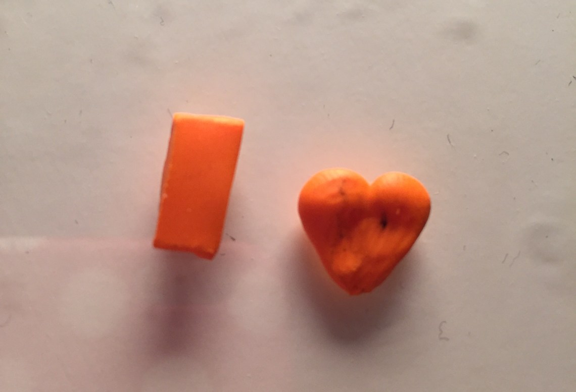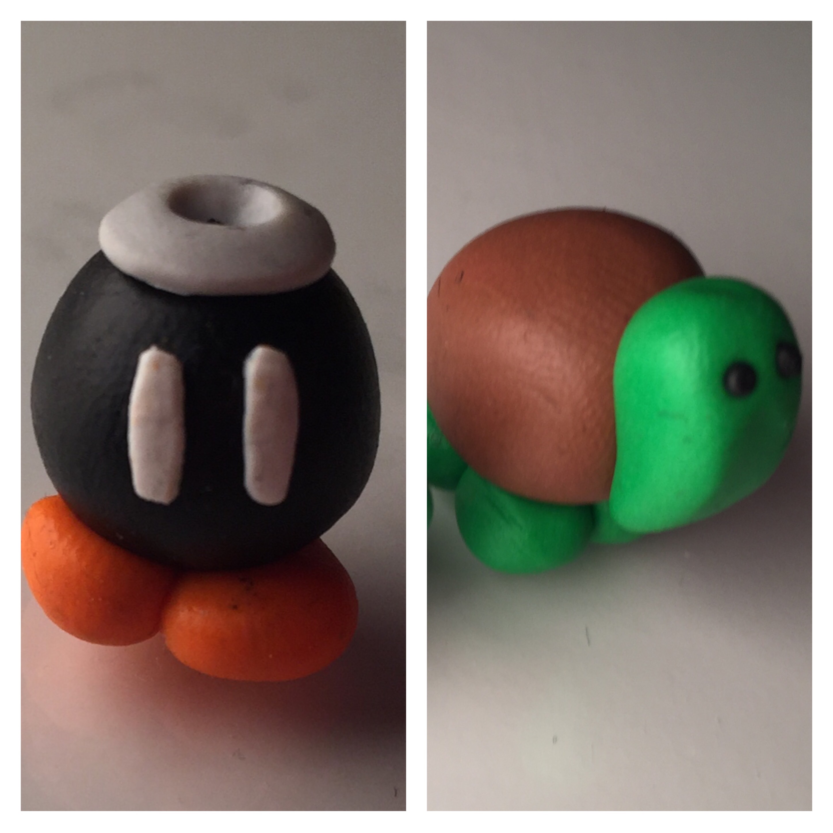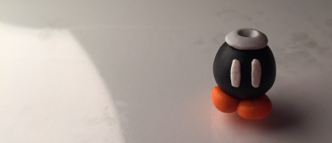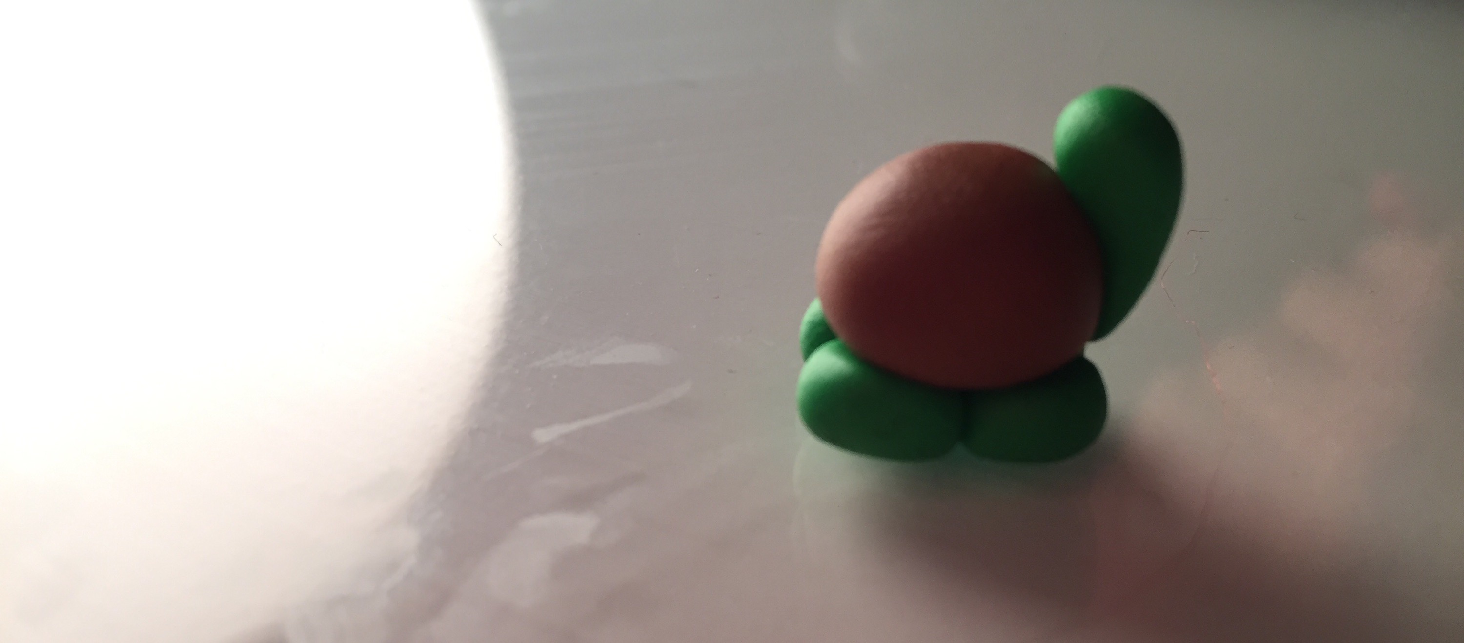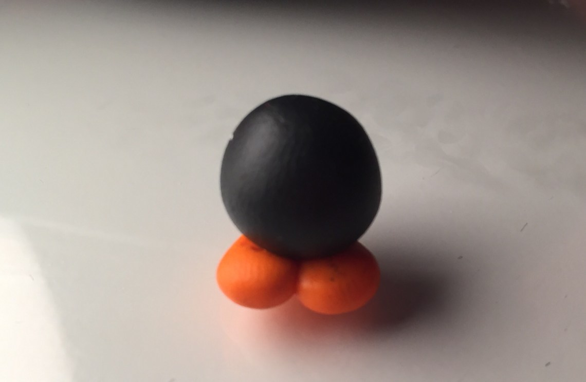 2. mit 2 kleinen orangenen Kugeln, kann man die Füße machen. Diese muss man dann in herzform bringen. Ganz wichtig ist hier, das der „Boden“ auf dem die kleine Bombe steht wirklich gerade ist, sonst fällt sie schnell um. (Hier seht ihr übrigens das Dilemma, wenn man zuerst die schwarze Knete benutzt, also Vorsicht!)