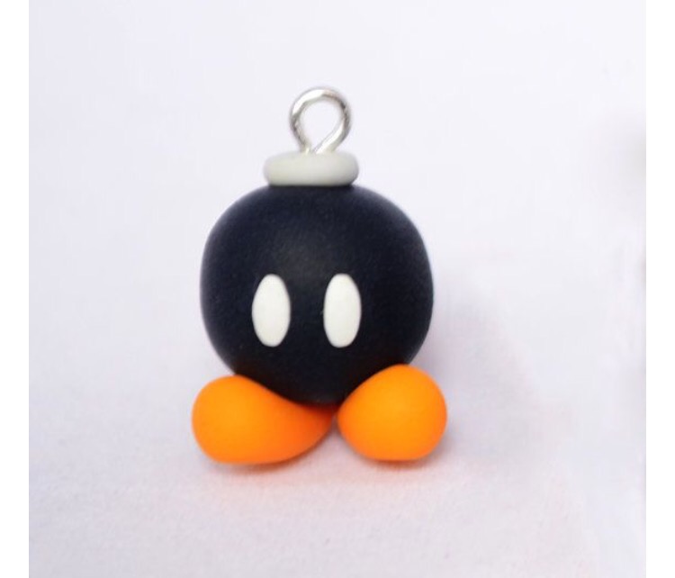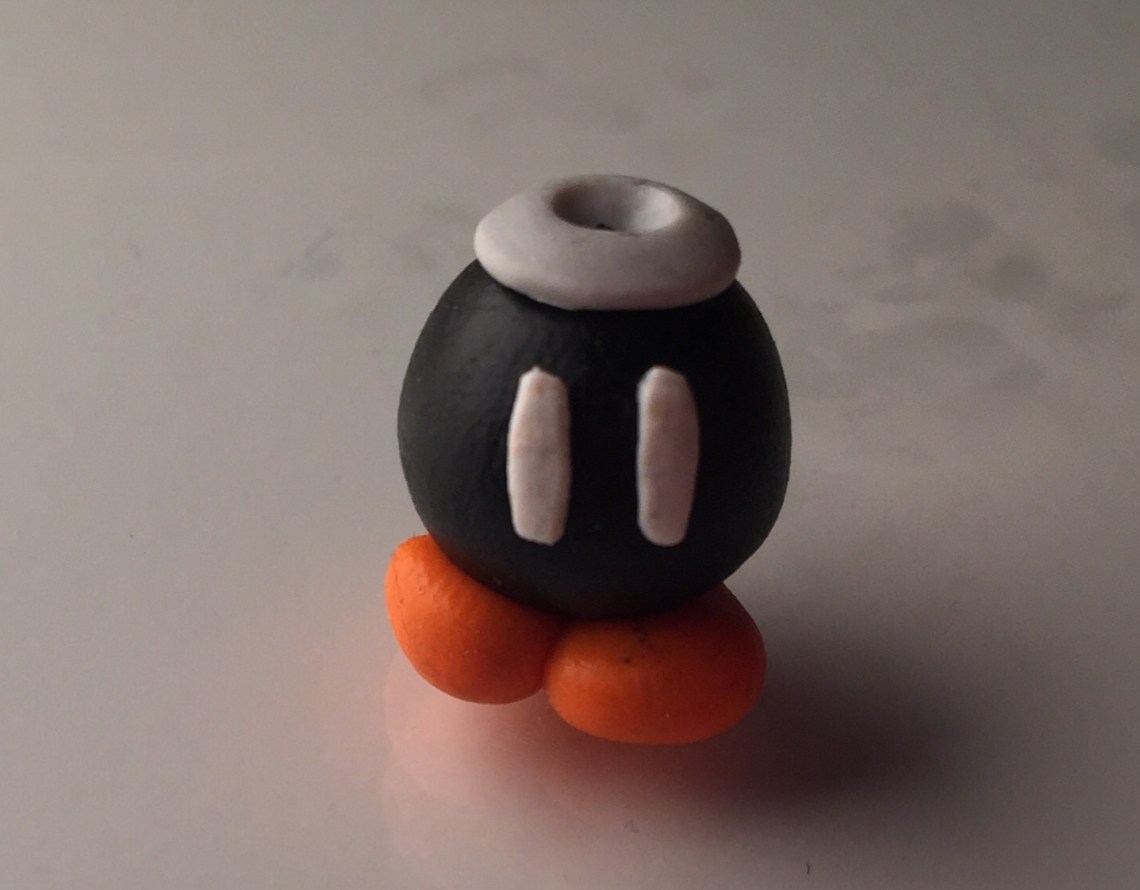 5. Die Augen kommen dann zusammen mit einem grauen Ring auf die bombe. Den Ring habe ich gemacht, indem ich eine kleine Kugel geformt hab, diese platt gedruckt und mit einer Nadel durchgestochen habe.