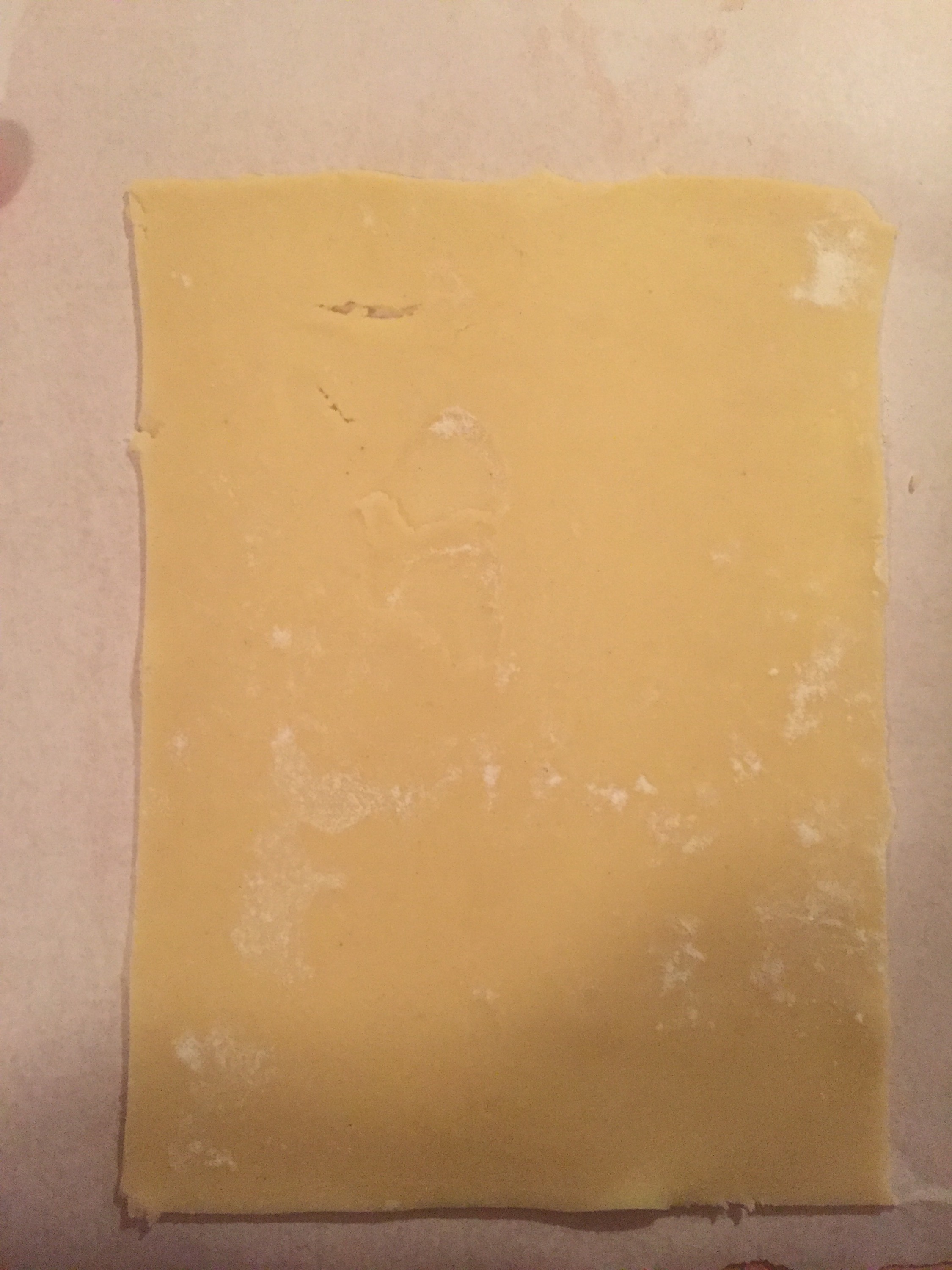 Danach rollt ihr die Teighälften zu Rechtecken aus. Meine sahen wie erwartet natürlich unterschiedlich groß aus….