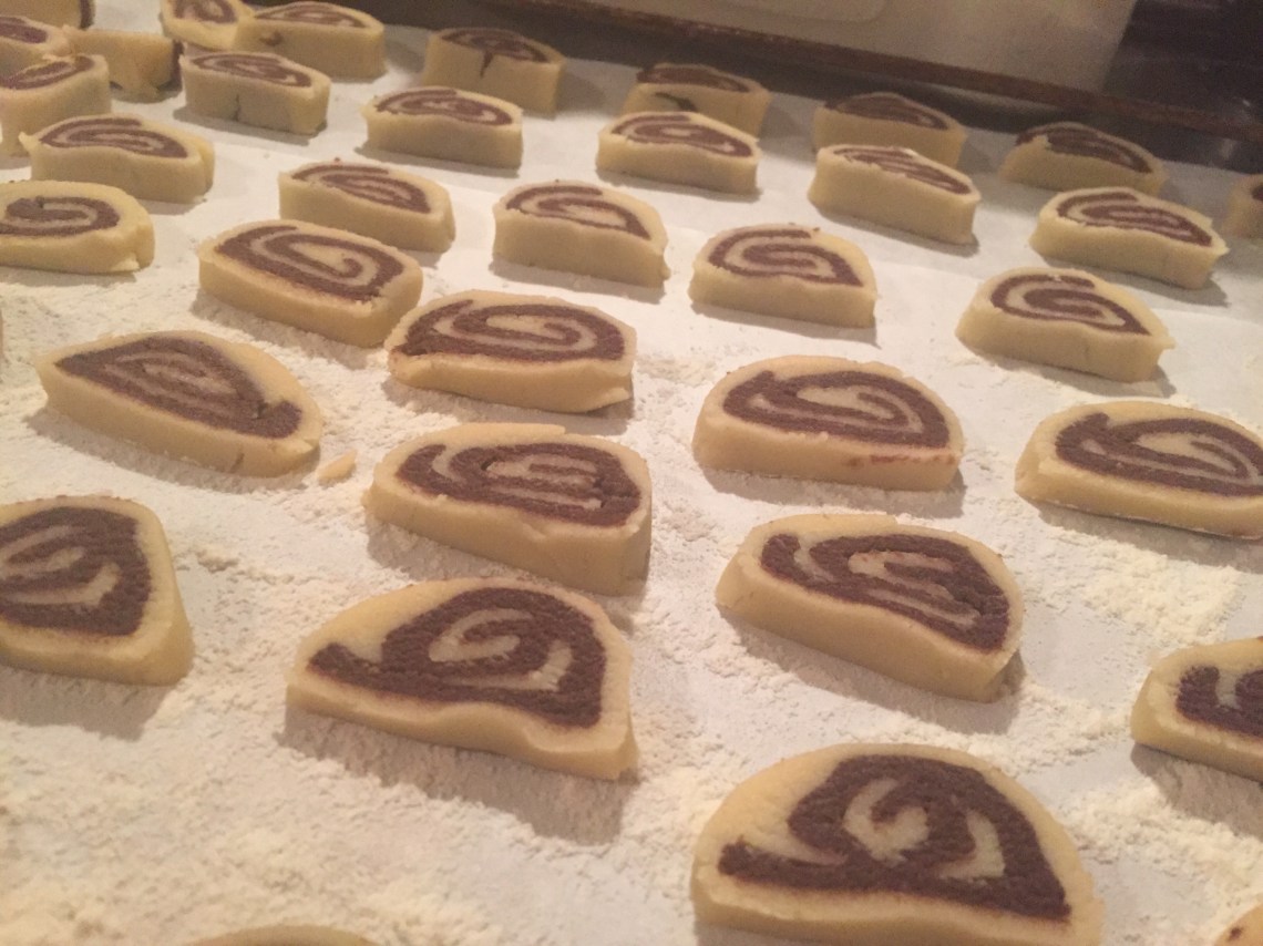 3. Backofen auf 180 Grad vorheizen und die Teigrolle klein schneiden. Die Kekse sollen Ca. 5 mm dick werden. Alles aufs Backblech legen.