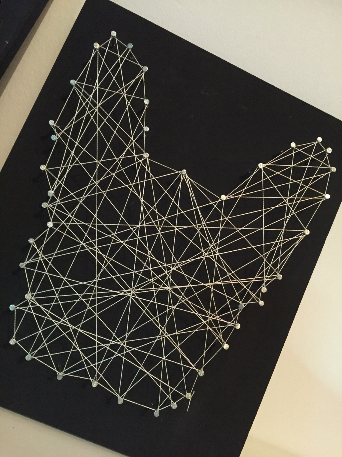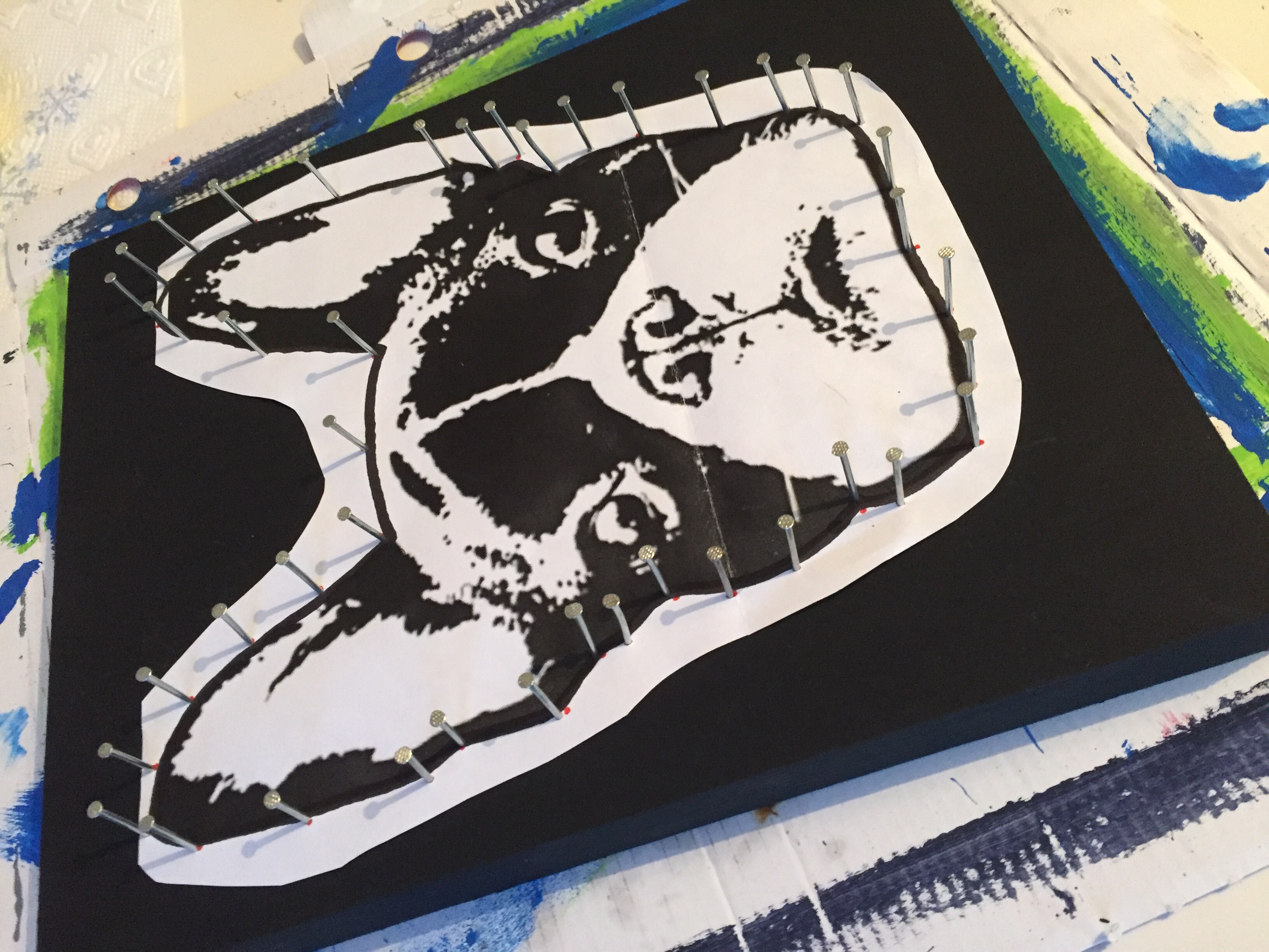 Als erstes malt ihr euer Brett schwarz an. Danach nehmt ihr eure Vorlage und macht mit einem Stift Punkte für die Nägel, der abstand der Nägel sollte so weit auseinander sein wie möglich.