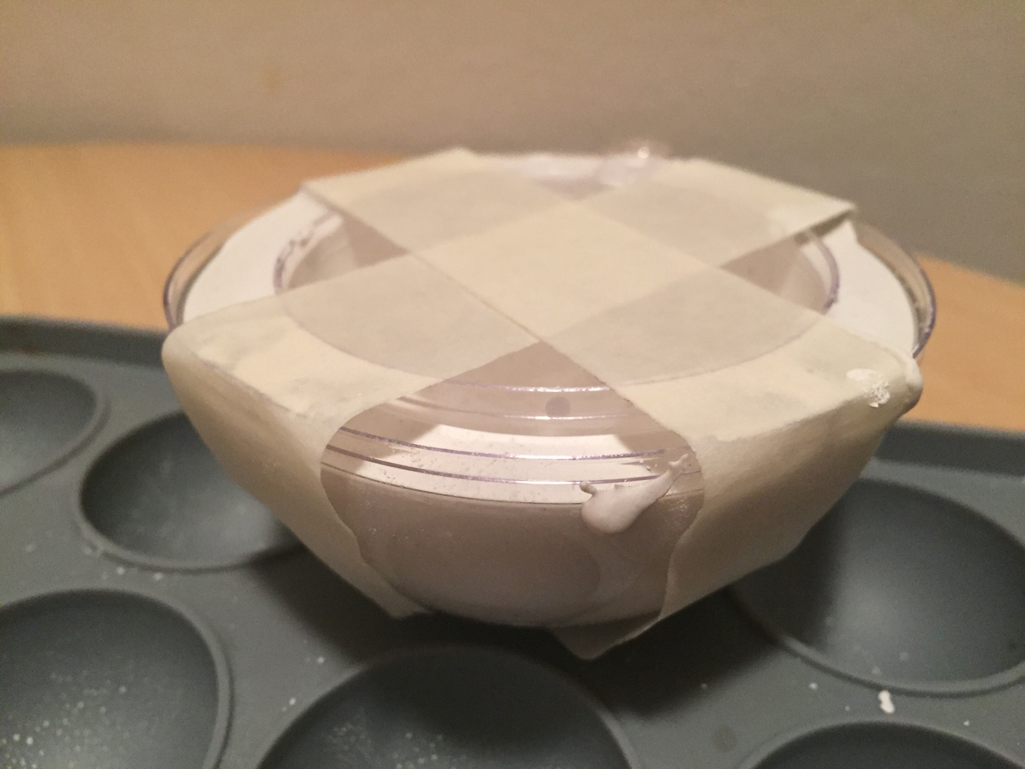 - Jetzt muss der flüssige Beton ca. zu 3/4 in die halbe Schale und die Kleinere muss eingedrückt werden. Da die bei mir jedoch immer nach oben „geschwommen“ ist habe ich sie mit einem Klebeband-Kreuz fixiert. So kann man die Schale schön mittig ausrichten.