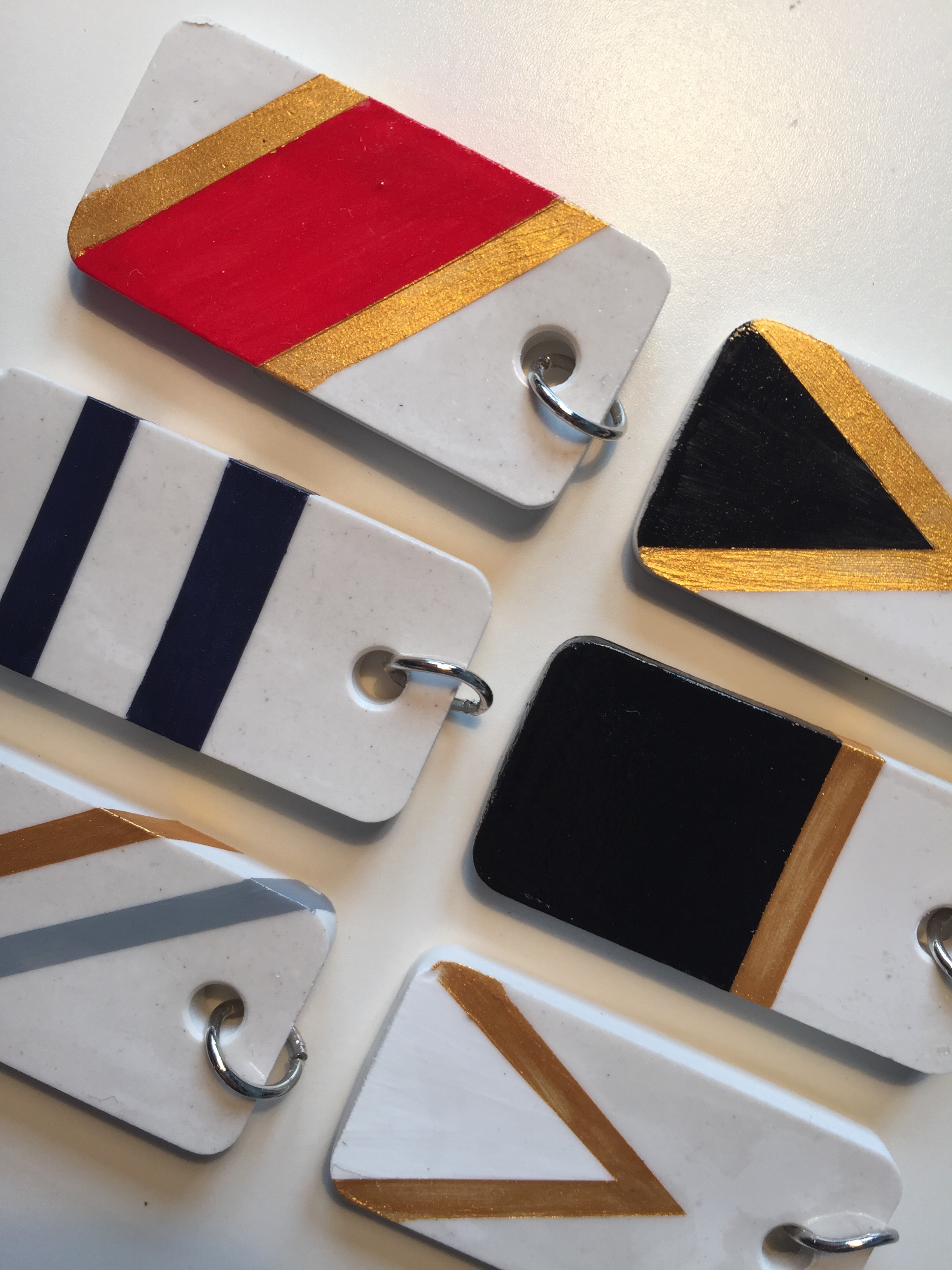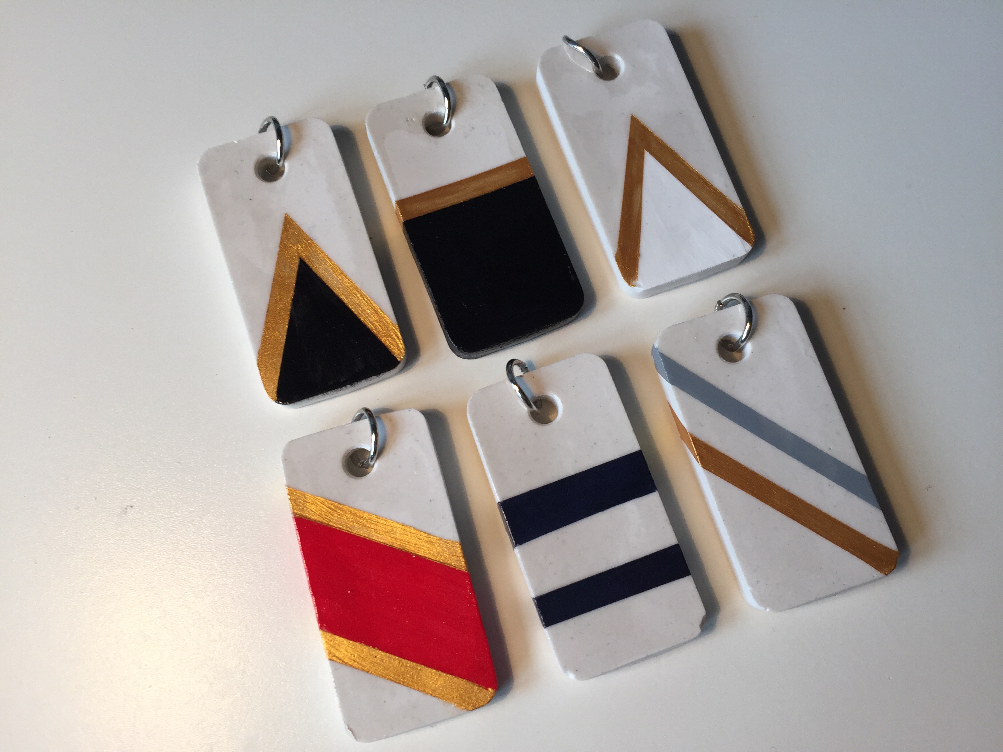 - Jetzt müsst ihr sie nur noch anmalen. Ich habe mich für klassische Farben wie schwarz, weiß und blau entschieden und mit Gold umrandet. Der rote Anhänger war mein Testobjekt. Für gerade Linien habe ich einfach Tesafilm hergenommen und das hat super funktioniert.