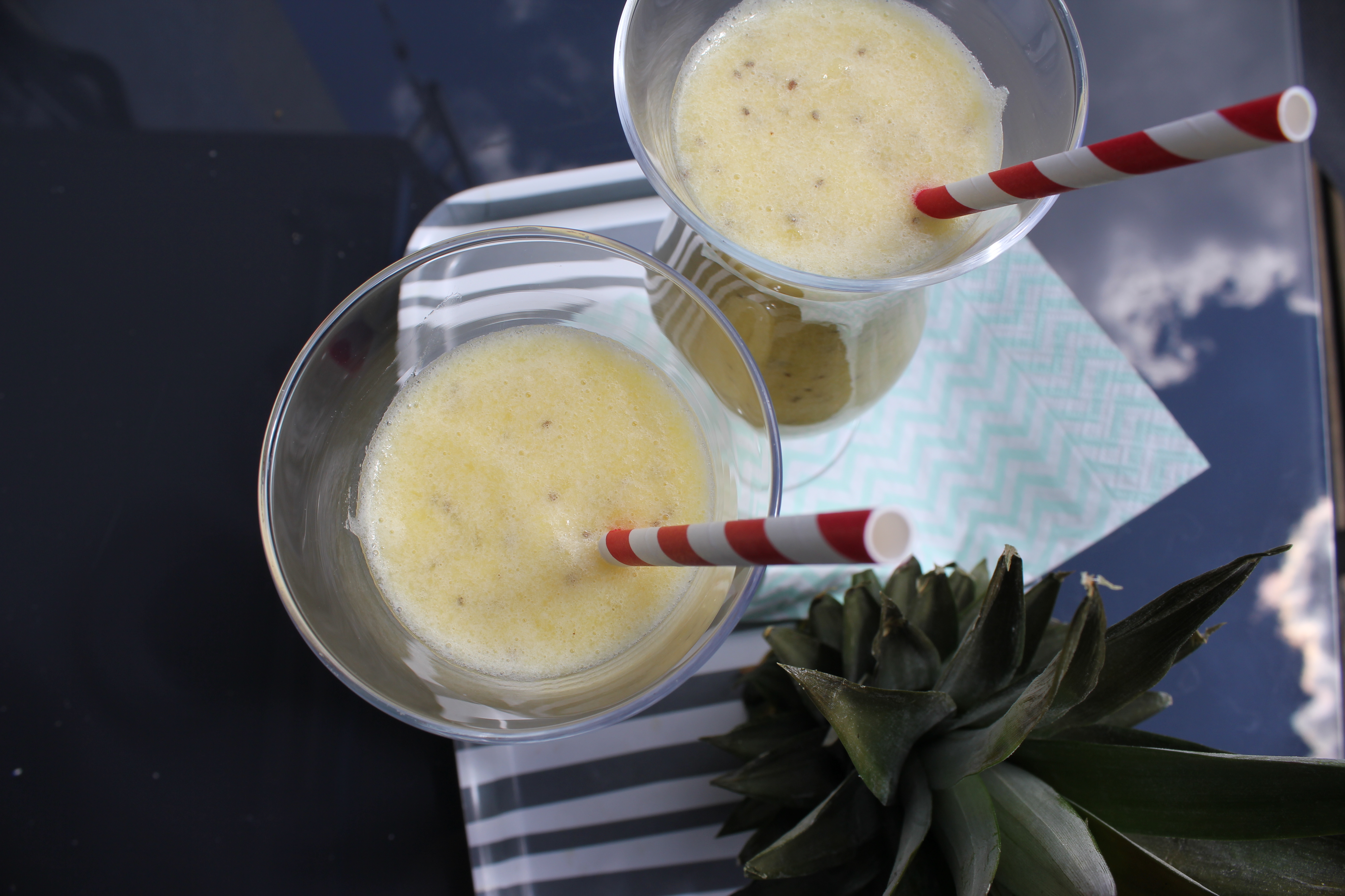 - Die Ananas und die Banane klein scheiden und mit einem Zauberstab mixen.