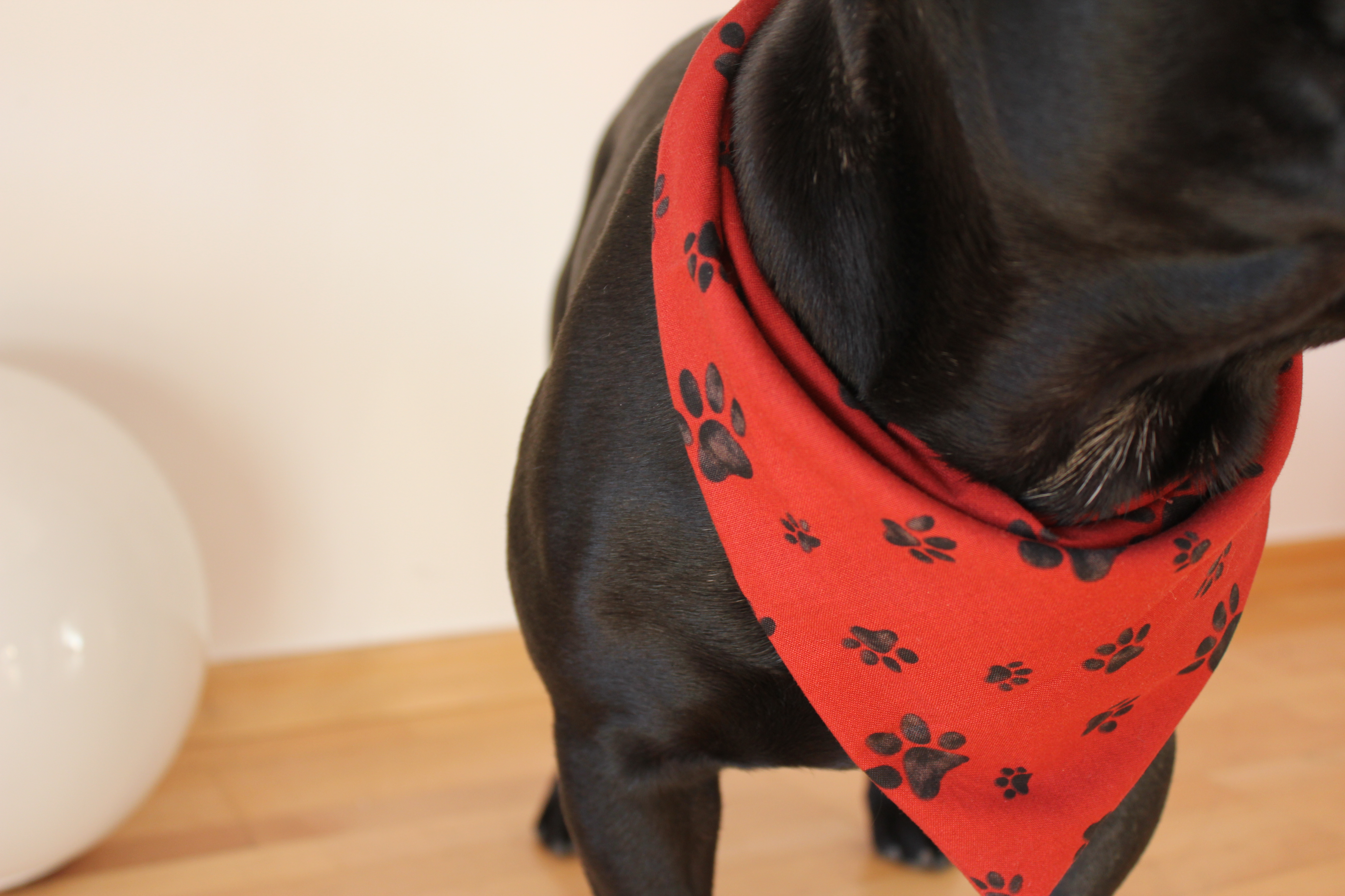Da mich zurzeit das Nähfieber gepackt hat, musste auch mein kleiner Frenchy Oskar beschenkt werden. Und so wurde aus einem Stück Stoff ein süßes Pfötchen-Halstuch. Als ich letztens in einem Laden für Tierbedarf war, habe ich schon mal ein tolles bayrisches Halstuch entdeckt, das sage und schreibe 22 Euro gekostet hat. Hallo?! Für ein Stück Stoff so viel Geld? Das kann ich besser. Und so habe ich innerhalb ein paar Minuten für weitaus weniger Geld ein kleines Schmuckstück gezaubert.