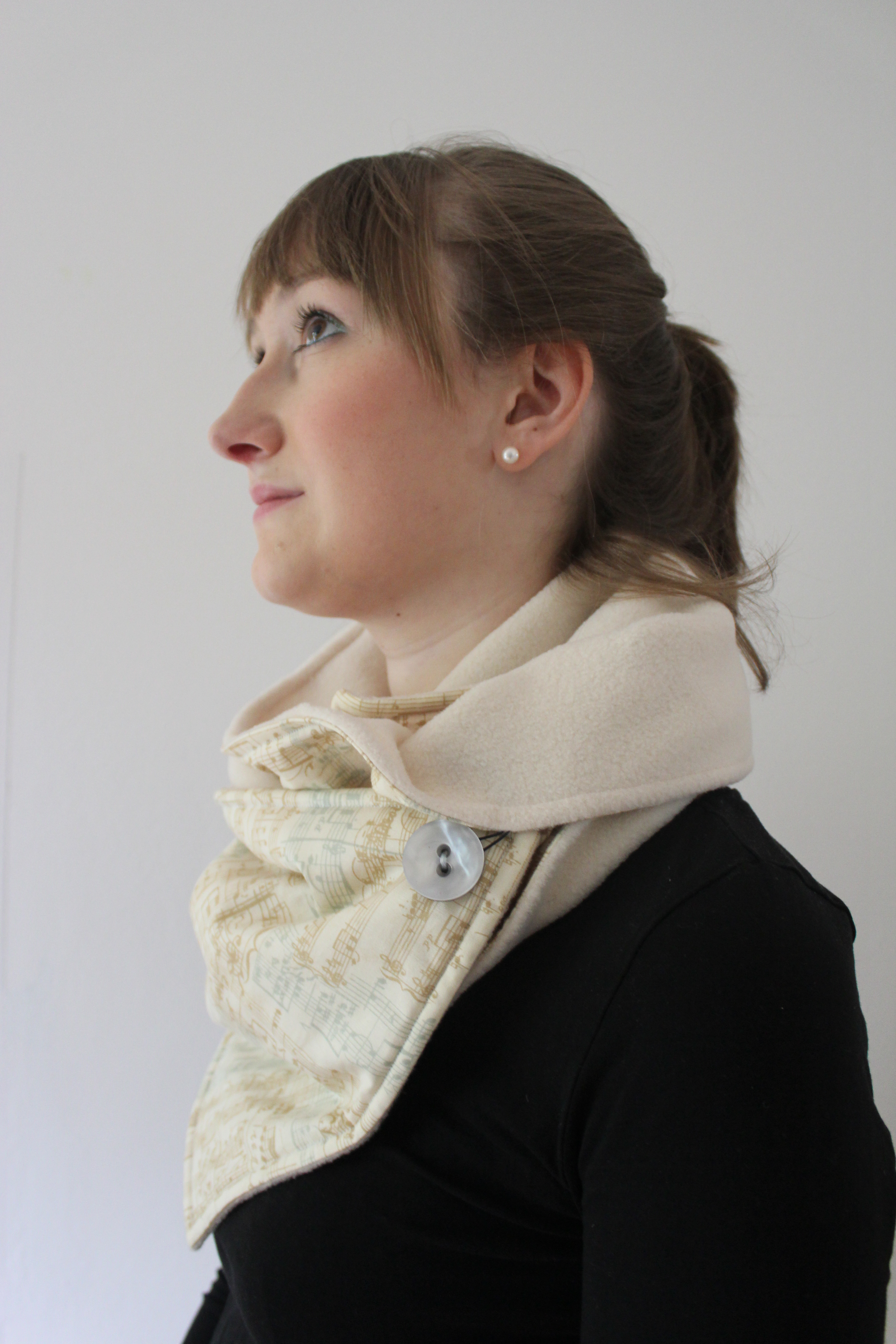 Meine Mama hatte letzten Oktober Geburtstag und zu ein paar Konzertkarten habe ich ihr noch etwas persönliches machen wollen. Und wenn sie schon eine eigene Musik Kneipe hat, was passt da besser als Noten? Und umso kälter es wird umso dringender braucht man einen kuscheligen Schal. Also stand schnell fest was es werden sollte. Da die Noten in Beige und Hellblau gehalten sind, habe ich noch ein passendes Garn dazu gekauft, einen Knopf aus meiner Knopfkiste (mit bestimmt 100 Millionen Knöpfen) gekramt und schon konnte es los gehen.