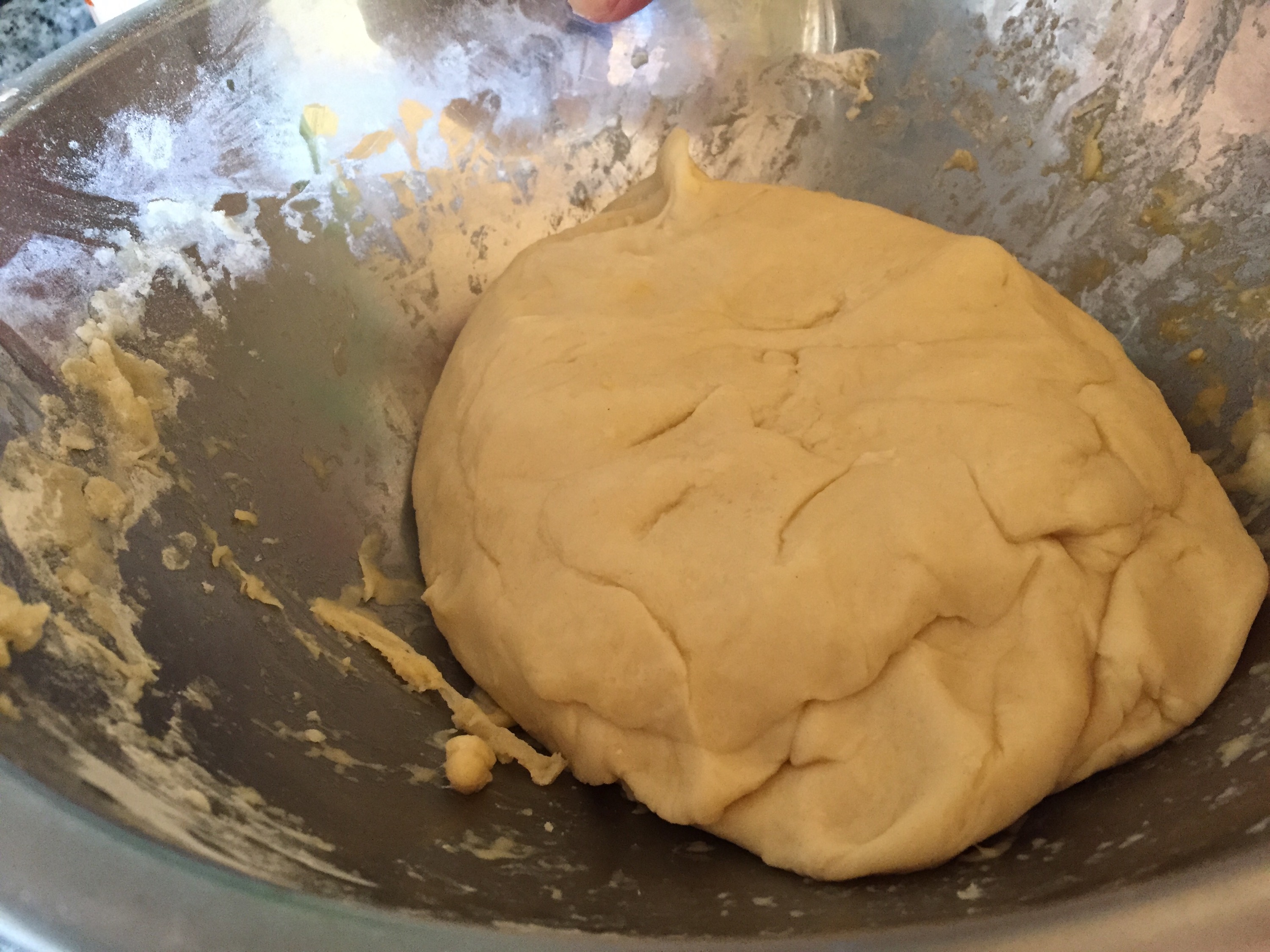 Also Schüssel schnappen, Mehl und Öl rein, heißes Wasser rein und zu einer pampigen Masse kneten. Nachdem der Teig etwas abgekühlt ist, kommt das Ei dazu. Ihr müsst so lange kneten und immer wieder etwas Mehl hinzufügen, bis ein glatter aber nicht zu trockener Teig entsteht. Wirklich grade nur so, dass es nicht mehr an den Fingern pappt. Jetzt kommt das Wichtigste: Teig nehmen und mindestens 15 mal mit voller Wucht in die Schüssel hauen. Damit man ihn später besser ausrollen kann. Danach die Schüssel mit dem Teig zudecken und kurz ruhen lassen.