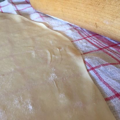 Der Teig wird in 3 Teile geteilt (ich mache 3 Strudel für Ca. 5 Personen) und auf dem Tuch dünn ausgerollt. Danach muss man das Muster des Tuches durchsehen können.