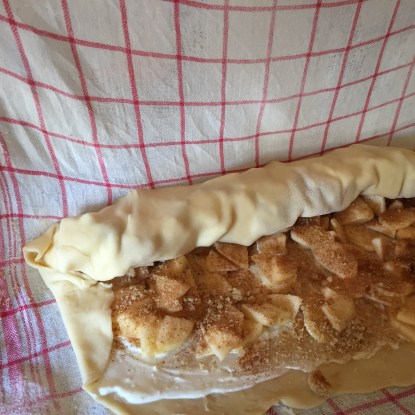 Der schwierigste Teil? Das Einrollen ! Ihr rollt von der schmaleren Seite zur Breiteren und das macht man, indem man das Küchentuch oben an den Ecken nimmt und den Strudel eindreht. Nach 1-2 Umdrehungen muss man die Seiten des Strudels einklappen, damit nichts rausfällt. Ich denke das Bild zeigt das ganz gut.