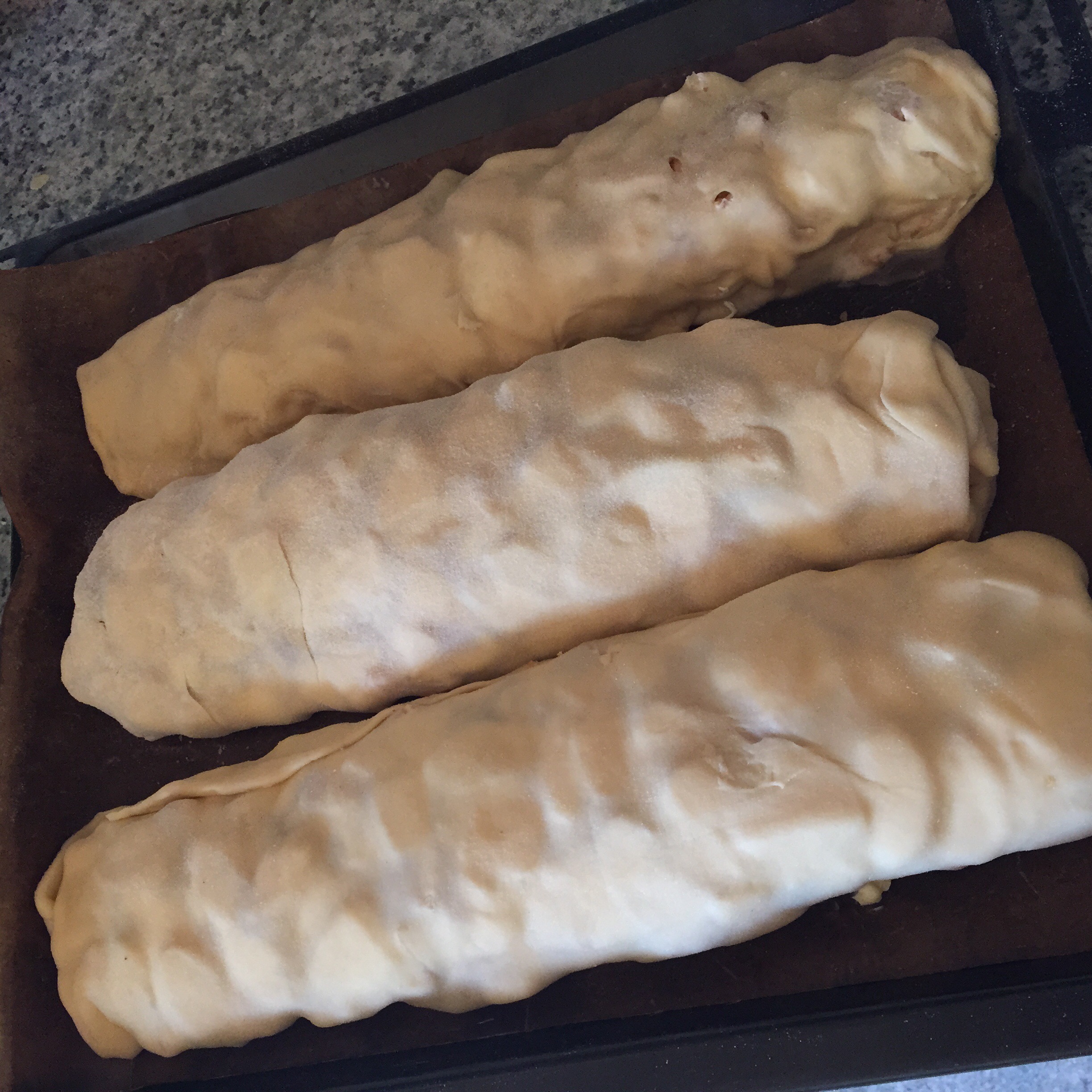 Die Strudel müssen bei 180 Grad ca. 1 Stunde im Ofen backen.