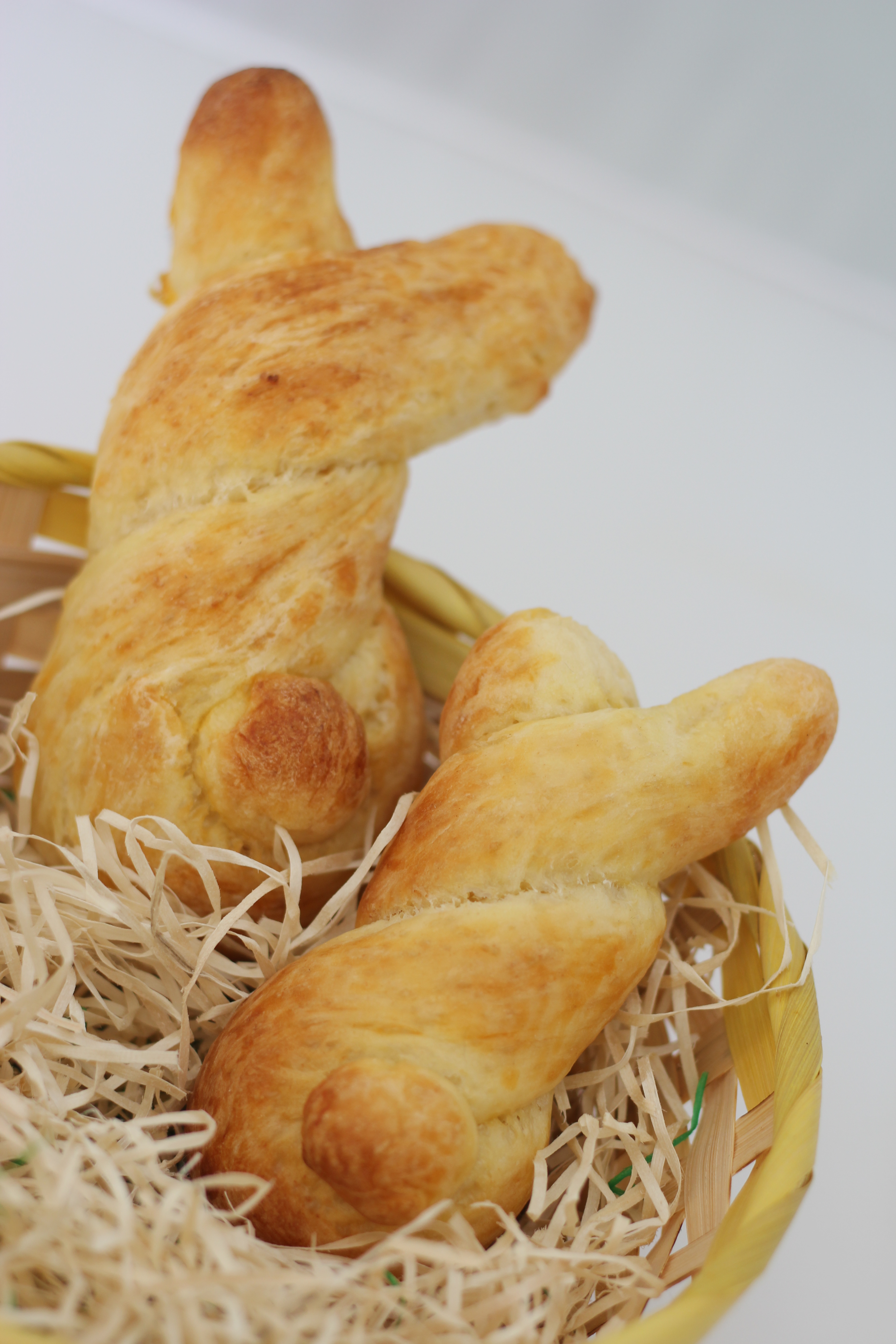 - Anschließend kurz durchkneten und 20cm lange Würste rollen. Dies dann in Hufeisen-Form hinlegen und 2x eindrehen. Dazu eine kleine Kugel formen und als Schwänzchen in die Mitte drücken. Hasen mit Abstand zueinander auf das Backblech legen und nochmal 15 Minuten gehen lassen.
