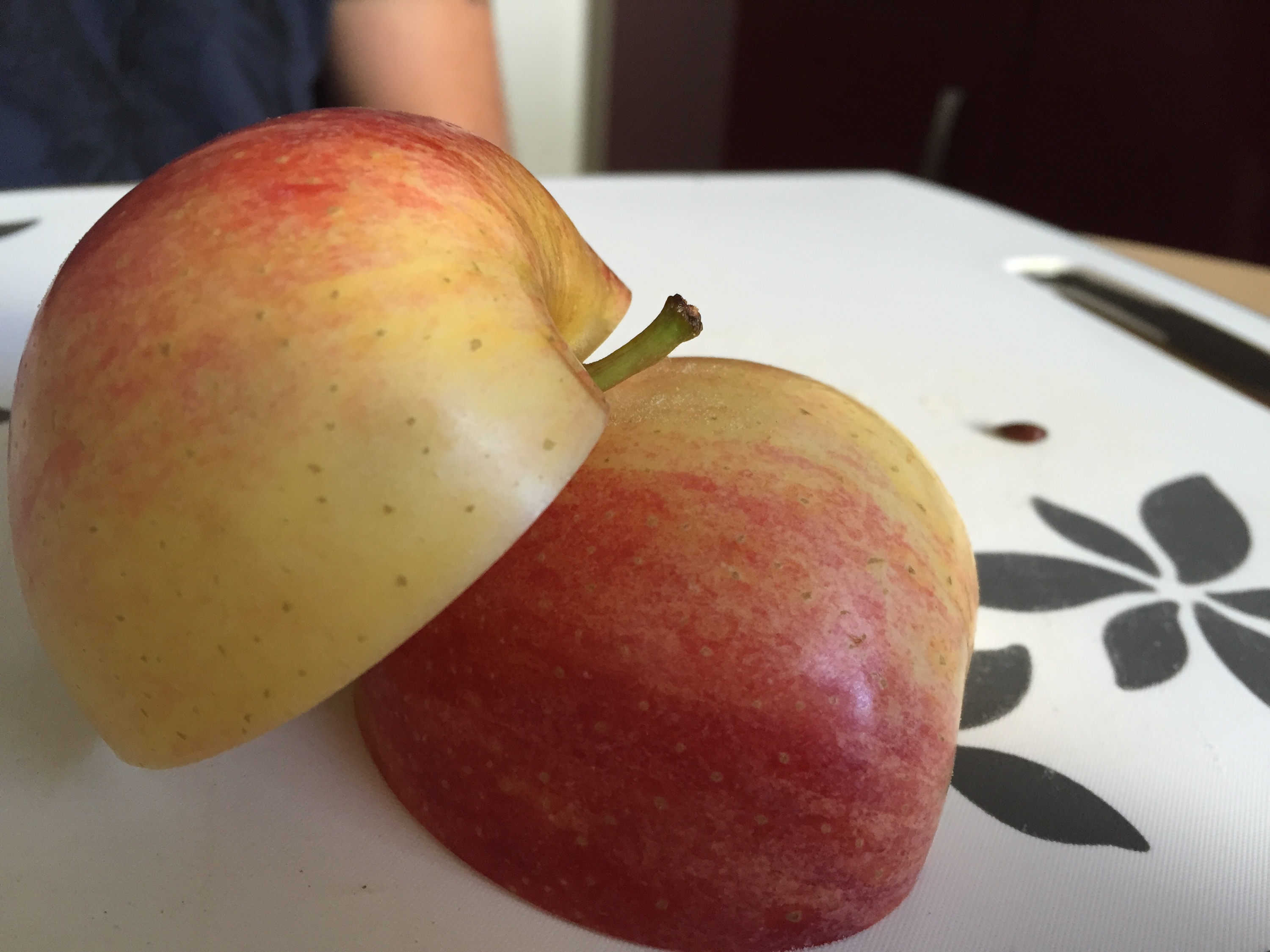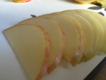 - Danach kommt der schwierige Teil, das Äpfel schneiden. Ihr teilt ihn in 4 Hälften, entkernen und so dünn wie möglich in Scheiben schneiden, damit sich die Stückchen besser biegen lassen.