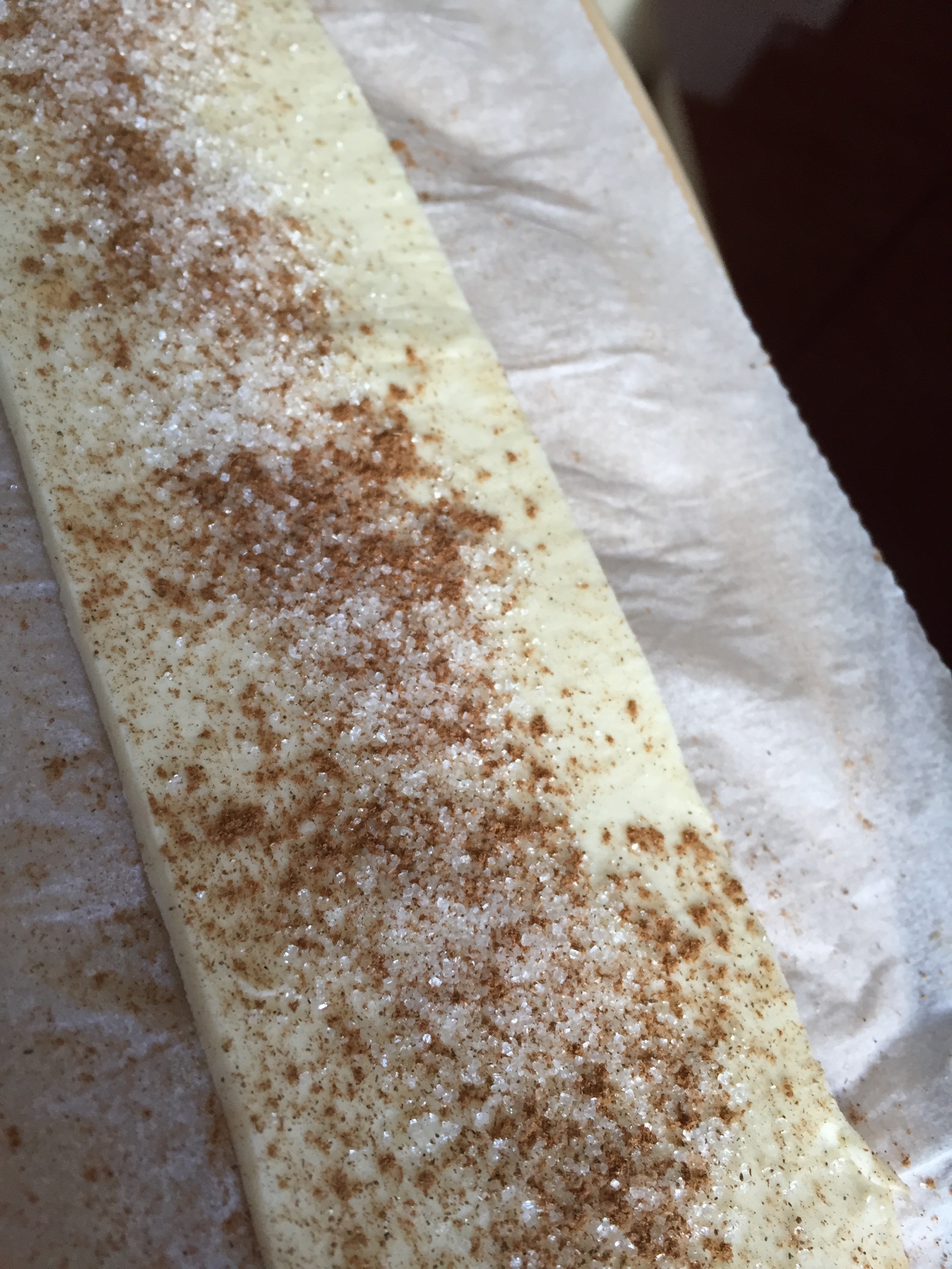- Und teilt diesen ihn in Streifen ein. Meine waren nach ein bisschen Übung alle so 4-5 cm breit. Falls sie nicht ganz grade sind macht das gar nichts. Jetzt kommt Zucker und Zimt drauf und ihr seit schon fast fertig.