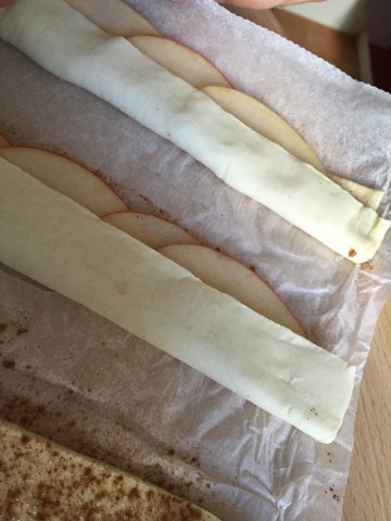 - So, jetzt kommt der etwas knifflige Teil. Ihr legt die Scheiben mit dem Bogen nach oben über den Rand eures Streifens. Dabei sollte die Hälfte des Streifens nicht bedeckt sein um sie über die Äpfel zu klappen. Ungefähr so:
