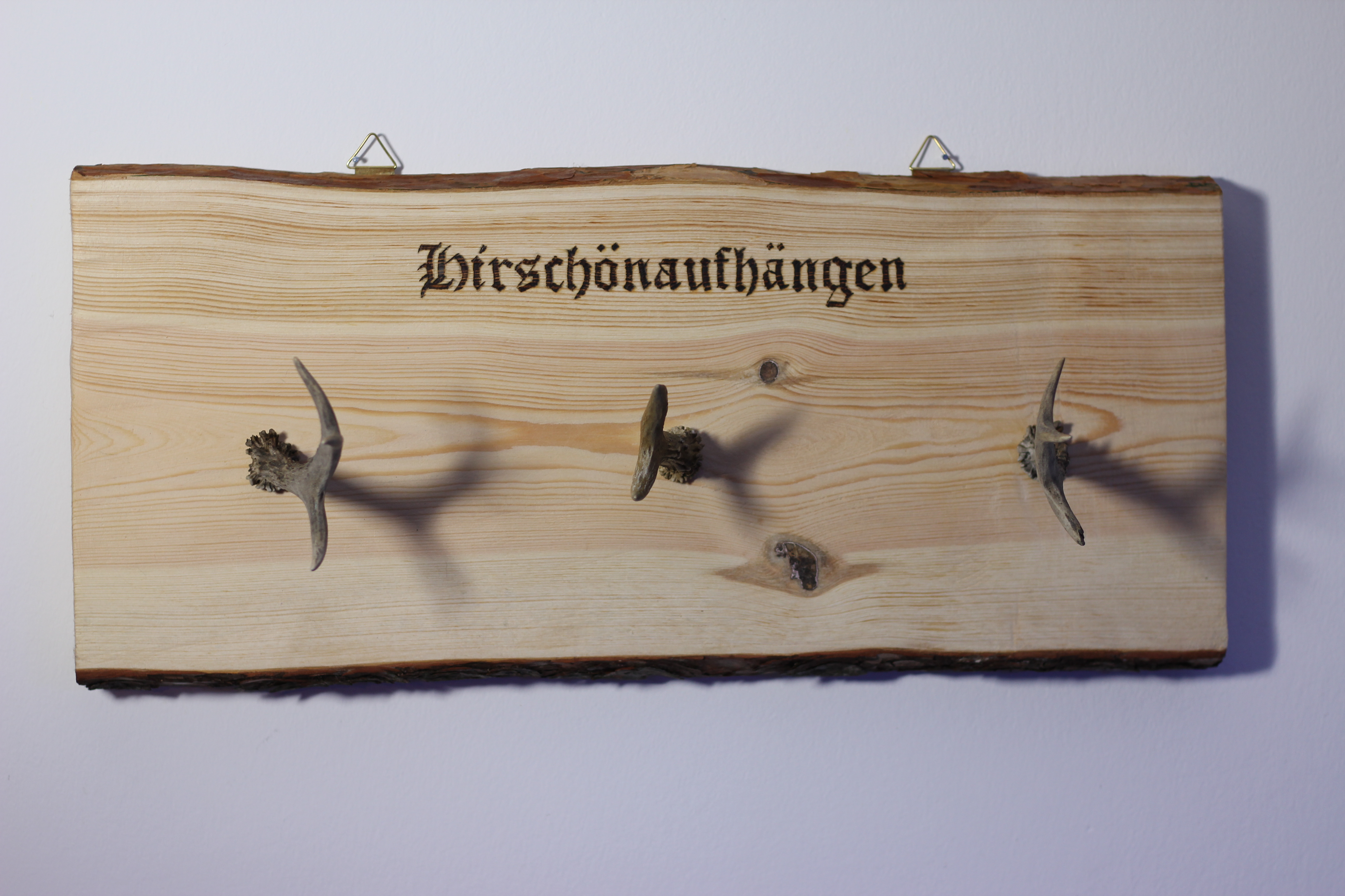 Für die echten Bayern unter uns ein Muss! Und auch für alle anderen eine tolle Möglichkeit seinen Eingangsbereich aufzuwerten. Ich habe diese Idee abgewandelt auf Pinterest gesehen und musste diesmal einfach ein bisschen größeres Projekt anfangen. Das Holz habe ich von einem Bekannten, der mir das Stück aus einem Baum geschnitten hat, danach habe ich es noch 2-3 Wochen trocknen lassen und schon konnte ich es weiter verwenden. Natürlich könnt ihr jede Art von Holz verwenden. Ob gebraucht von Ebay, einem Stück aus dem Garten oder dem Baumarkt. Mann kann nehmen was einem gefällt. Prinzipiell würde auch ein dicker Ast gehen. Die Geweihe habe ich von meinem Opa aber auch diese kann man in Ebay oder auch oft auf Flohmärkten kaufen. Dazu braucht ihr nur noch ein paar Schrauben, einen Bohrer und 2 Aufhänger um die Garderobe an der Wand zu befestigen. Ich habe meine Garderobe noch mit einem witzigen Spruch verziert und schon hängt das gute Stück!